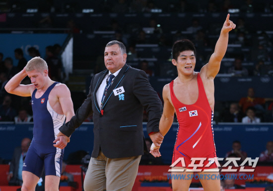 7일오후(현지시각) 영국 런던 엑셀 노스아레나2에서 열린 남자 레슬링 그레코로만형 66kg급 8강 경기에서 김현우 선수가 에드가라스 벤카이티스(리투아니아)를 2-0으로 누른뒤 환호하고 있다. 김현우는 벤카이티스를 이겨 4강에 진출했다. 20120807 런던=올림픽사진공동취재단m