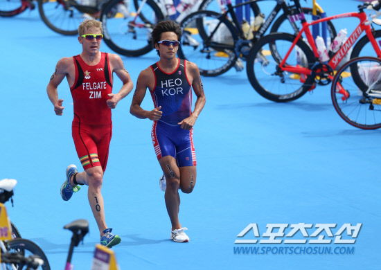 런던올림픽 남자 트라이애슬론(철인3종)에 출전한 한국의 허민호가 7일 오후(현지시각) 런던 하이드파크에서 열린 결선 경기에서 달리기를 하고 있다.