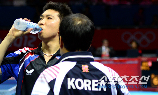 남자탁구 단체 대표팀 유승민, 오상은, 주세혁이 중국을 상대로 금메달에 도전했다. 8일 런던 엑셀노우스아레나 경기장에서 남자탁구 단체팀이 중국과 결승전을 펼쳤다. 첫 번째 단식경기를 펼친 유승민이 중국의 마롱을 상대 했다. 경기를 끌려가자 답답한 표정으로 물을 마시고 있는 유승민.