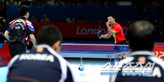 남자탁구 단체 대표팀 유승민, 오상은, 주세혁이 중국을 상대로 금메달에 도전했다. 8일 런던 엑셀노우스아레나 경기장에서 남자탁구 단체팀이 중국과 결승전을 펼쳤다. 첫 번째 단식경기를 펼친 유승민이 중국의 마롱을 상대하고 있다. 마롱에게 득점을 허용하며 아쉬워하고 있는 유승민과 경기를 지켜보고 있는 유남규 감독(오른쪽).