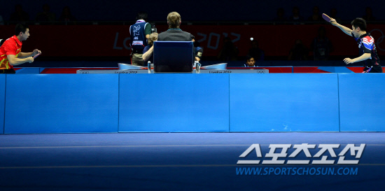 남자탁구 단체 대표팀 유승민, 오상은, 주세혁이 중국을 상대로 금메달에 도전했다. 8일 런던 엑셀노우스아레나 경기장에서 남자탁구 단체팀이 중국과 결승전을 펼쳤다. 첫 번째 단식경기를 펼친 유승민(오른쪽)이 중국의 마롱을 상대 했다.