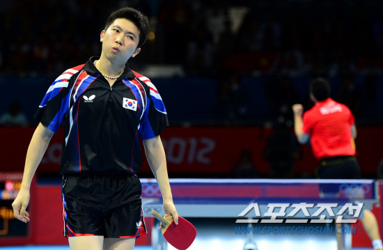 남자탁구 단체 대표팀 유승민, 오상은, 주세혁이 중국을 상대로 금메달에 도전했다. 8일 런던 엑셀노우스아레나 경기장에서 남자탁구 단체팀이 중국과 결승전을 펼쳤다. 첫 번째 단식경기를 펼친 유승민이 중국의 마롱을 상대하고 있다. 마롱에게 득점을 허용하며 아쉬워하고 있는 유승민.