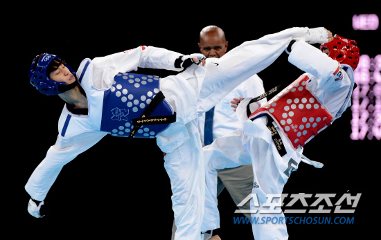 8일 영국 런던 엑셀 사우스아레나 태권도경기장에서 열린 2012런던올림픽 태권도 남자 58㎏급 8강전에서 한국의 이대훈이 이집트의 타메르 베이유미에게 발차기를 성공시키고 있다./20120808 런던=올림픽사진공동취재단g
