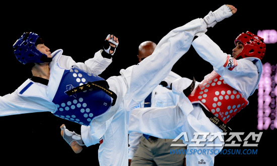 8일 영국 런던 엑셀 사우스아레나 태권도경기장에서 열린 2012런던올림픽 태권도 남자 58㎏급 8강전에서 한국의 이대훈이 이집트의 타메르 베이유미에게 발차기를 성공시키고 있다./20120808 런던=올림픽사진공동취재단g
