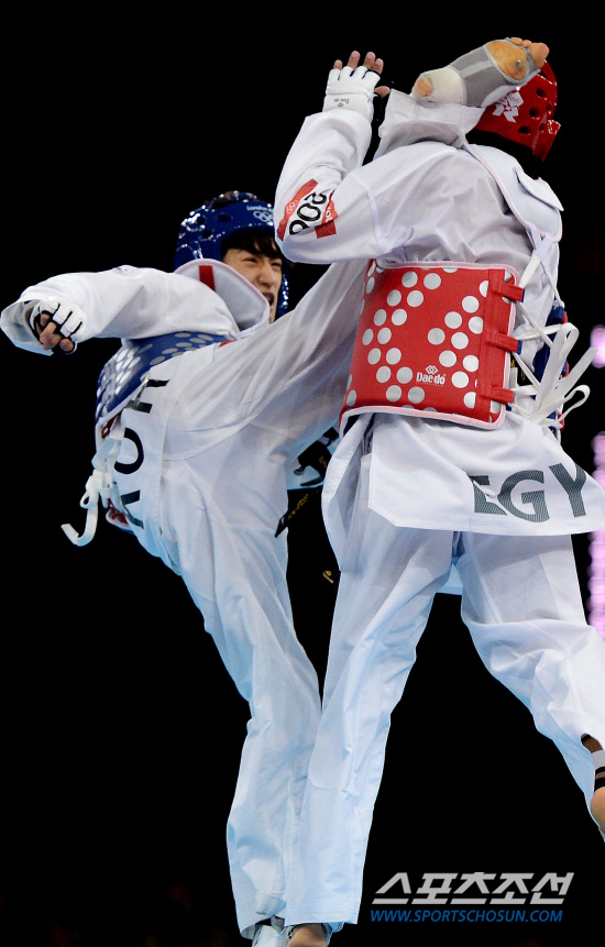 8일 영국 런던 엑셀 사우스아레나 태권도경기장에서 열린 2012런던올림픽 태권도 남자 58㎏급 8강전에서 한국의 이대훈이 이집트의 타메르 베이유미에게 발차기를 성공시키고 있다./20120808 런던=올림픽사진공동취재단g