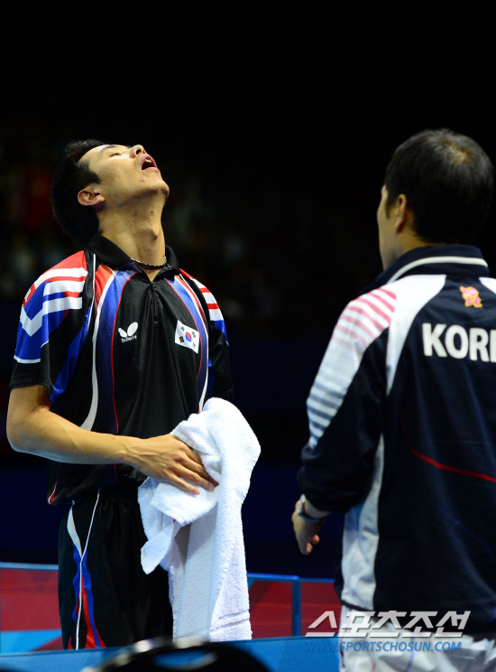 남자탁구 단체 대표팀 유승민, 오상은, 주세혁이 중국을 상대로 금메달에 도전했다. 8일 런던 엑셀노우스아레나 경기장에서 남자탁구 단체팀이 중국과 결승전을 펼쳤다. 두 번째 단식경기에 출전한 주세혁이 중국의 장지케를 상대로 플레이를 펼치고 있다. 경기를 끌려가자 답답한 표정을 짓고 있는 주세혁.