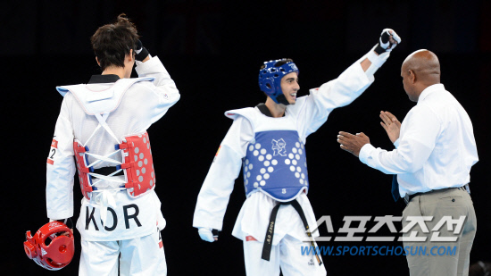 8일 오후(현지시간) 런던 엑셀 아레나에서 열린 태권도 남자 58kg 이하급 결승전에 출전한 이대훈 선수가 스페인의 호엘 곤살레스 보니야에게 8-17로 패배하여 은메달을 획득했다. 이대훈 선수가 경기에 패하고 아쉬워 하고 있다.20120808런던=올림픽사진공동취재단L
