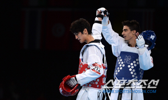 8일 영국 런던 엑셀 사우스아레나 태권도경기장에서 열린 2012런던올림픽 태권도 남자 58㎏급 결승에서 승자인 스페인의 호엘 곤살레스가 이대훈의 손을 들어주고 있다./20120808 런던=올림픽사진공동취재단g