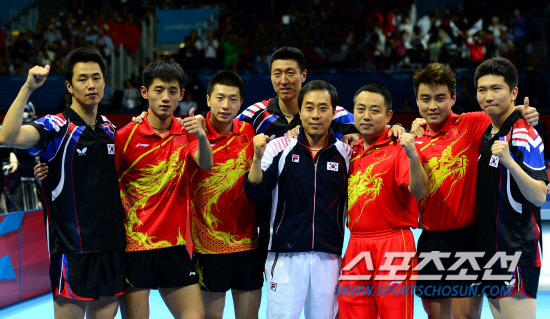 남자탁구 단체 대표팀(유승민, 오상은, 주세혁)이 중국의 벽을 넘지 못하고 은메달에 머물렀다. 8일 런던 엑셀노우스아레나 경기장에서 남자탁구 단체팀이 중국과 결승전을 펼쳤다. 세 번째 복식경기에서 유승민, 오상은 조가 중국의 왕하오, 장지케 조를 상대했다. 대표팀은 복식마저 패배하며 0대3 완패 했다. 경기 종료 후 중국 선수들과 함께 포즈를 취하고 있는 대표팀.