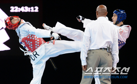 결정적 한방! 8일 오후(현지시간) 런던 엑셀 아레나에서 열린 태권도 남자 58kg 이하급 결승전에 출전한 이대훈 선수가 스페인의 호엘 곤살레스 보니야에게 8-17로 패배하여 은메달을 획득했다.이대훈 선수가 결정적으로 보니야 선수에게 득점을 내주고 있다.20120808런던=올림픽사진공동취재단L