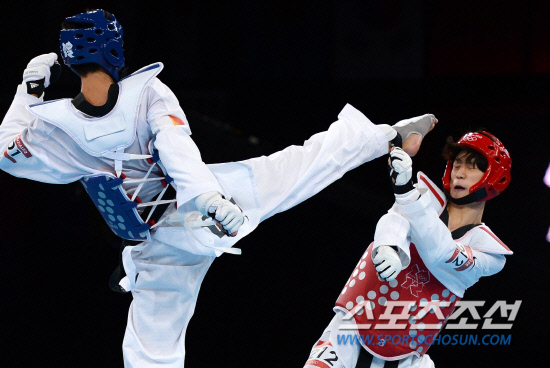 8일 영국 런던 엑셀 사우스아레나 태권도경기장에서 열린 2012런던올림픽 태권도 남자 58㎏급 결승에서 한국의 이대훈이 스페인의 호엘 곤살레스에게 공격을 허용하고 있다./20120808 런던=올림픽사진공동취재단g