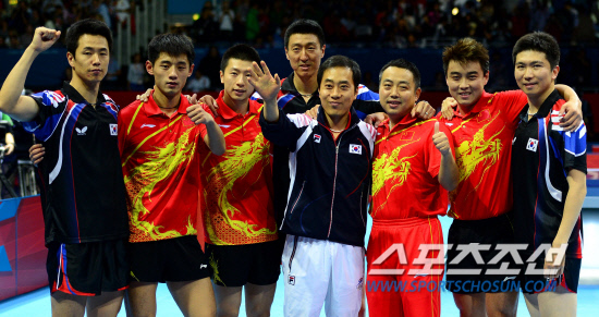 남자탁구 단체 대표팀(유승민, 오상은, 주세혁)이 중국의 벽을 넘지 못하고 은메달에 머물렀다. 8일 런던 엑셀노우스아레나 경기장에서 남자탁구 단체팀이 중국과 결승전을 펼쳤다. 세 번째 복식경기에서 유승민, 오상은 조가 중국의 왕하오, 장지케 조를 상대했다. 대표팀은 복식마저 패배하며 0대3 완패 했다. 경기 종료 후 중국 선수들과 함께 포즈를 취하고 있는 대표팀.