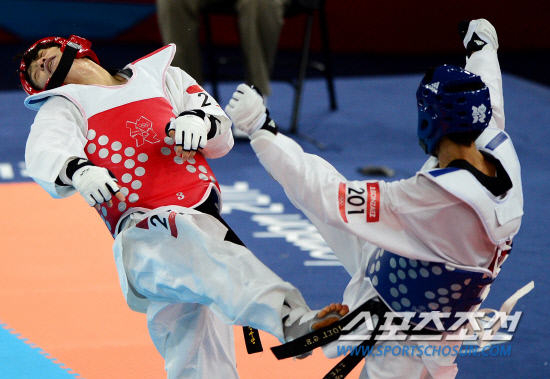 태권도 이대훈이 8일 런던 엑셀사우스아레나 경기장에서 열린 남자 58kg급에서 금메달에 도전했다. 결승전에서 이대훈은 스페인의 호엘 곤살레스 보니야에게 8-17로 패해 아쉬운 은메달을 차지했다. 경기 중 머리 3점 공격을 허용하고 있는 이대훈(왼쪽).