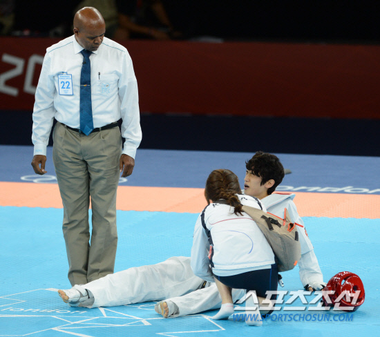 2012 런던올림픽 태권도 대표팀의 첫 주자로 나선 이대훈이 8일 오후(현지시간) 영국 런던의 엑셀런던 사우스아레나에서 열린 2012 런던올림픽 태권도 남자 58㎏급 결승에서 세계 랭킹 1위의 호엘 곤살레스 보니야(스페인)과 대결 중에 부상을 당하면서 고통스러워하고 있다.