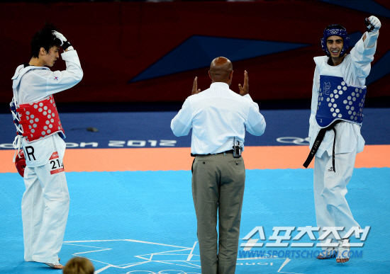 태권도 이대훈이 8일 런던 엑셀사우스아레나 경기장에서 열린 남자 58kg급에서 금메달에 도전했다. 결승전에서 이대훈은 스페인의 호엘 곤살레스 보니야에게 8-17로 패해 아쉬운 은메달을 차지했다. 경기를 마치고 아쉬워하고 있는 이대훈.