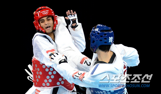 8일 오후 런던 엑셀 아레나에서 열린 태권도 남자 58kg 이하급 8강전에 출전한 이대훈 선수가 이집트 타버 바유미 선수를 맞아 발차기를 성공하고 있다.20120808런던=올림픽사진공동취재단L