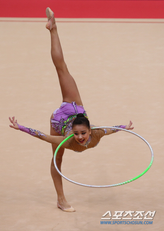 런던올림픽 리듬체조 개인종합에 출전한 한국의 손연재가 9일 오후(현지시각) 런던 윔블리 아레나에서 열린 예선 경기에서 차이코프스키의 <호두까기 인형>에 맞쳐 멋진 후프 연기를 펼쳐 보이고 있다. 손연재는 28.075점을 기록했다. 리듬체조 개인종합은 후프와 볼, 리본, 곤봉 등 4개 종목 점수를 합산해 순위를 정한다. 예선 10위 안에 들어야 결선 진출이 가능하다.