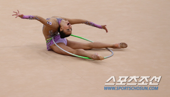 런던올림픽 리듬체조 개인종합에 출전한 한국의 손연재가 9일 오후(현지시각) 런던 윔블리 아레나에서 열린 예선 경기에서 차이코프스키의 <호두까기 인형>에 맞쳐 멋진 후프 연기를 펼쳐 보이고 있다. 손연재는 28.075점을 기록했다. 리듬체조 개인종합은 후프와 볼, 리본, 곤봉 등 4개 종목 점수를 합산해 순위를 정한다. 예선 10위 안에 들어야 결선 진출이 가능하다.