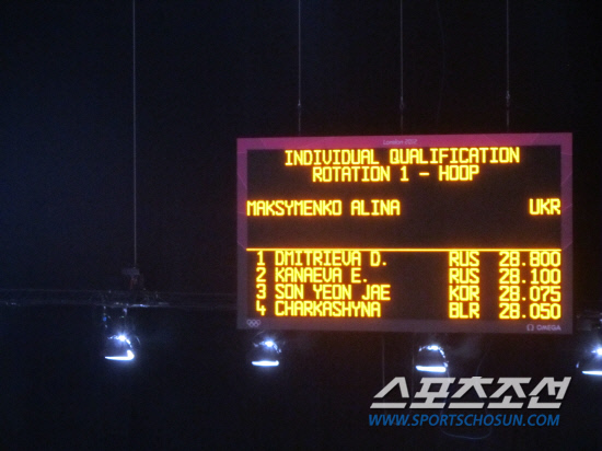 손연재는 9일(한국시각) 영국 런던 웸블리아레나에서 열린 런던올림픽 리듬체조 후프에서 28.075점으로 전체 24명 중 3위에 올랐다. 난도 점수(D) 9.500점, 예술점수(A) 9.350점, 실시점수(E) 9.225점 등 고른 점수를 받았다. 올림픽 2연패를 노리는 '여제' 예브게니아 카나예바(러시아, 28.100점)와 불과 0.025점밖에 차이나지 않는 고득점이었다. 카나예바는 후프를 놓치는 아까운 실수로 '신성' 다리아 드미트리예바(러시아, 28.800점)에 이어 이 종목 2위에 올랐다. 첫 종목에서 한자릿수 랭킹 진입의 경쟁자인 실비아 미테바, 알리아 가라예바, 알리나 막시멘코 등 유럽 선수들을 줄줄이 압도했다.