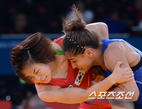런던올림픽 여자 레슬링 자유형 55킬로그램에 출전한 한국의 엄지은 선수가 9일 오후(현지시간) 런던 엑셀경기장에서 열린 예선전에서 마르와 아므리(튀니지)선수를 공격하고있다. 경기에 패배해서 16강전 진출이 무산?榮?