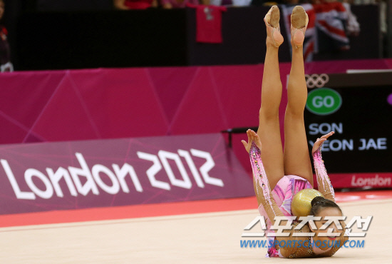 한국 리듬체조의 요정 손연재가 9일 오후(현지시각) 영국 런던 웹블리 아레나에서 열린 리듬체조 여자 개인종합 예선경기에서 'Limelight-Les Melodies De MonCoeur'에 맞춰 공연기를 선보이고 있다. 손연재는 세계 정상급 선수들과 맞서 올림픽 사상 첫 결승진출을 노리게 된다. 20120807 런던=올림픽사진공동취재단m
