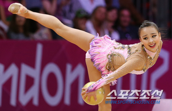 한국 리듬체조의 요정 손연재가 9일 오후(현지시각) 영국 런던 웹블리 아레나에서 열린 리듬체조 여자 개인종합 예선경기에서 'Limelight-Les Melodies De MonCoeur'에 맞춰 공연기를 선보이고 있다. 손연재는 세계 정상급 선수들과 맞서 올림픽 사상 첫 결승진출을 노리게 된다. 20120807 런던=올림픽사진공동취재단m