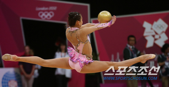 한국 리듬체조의 요정 손연재가 9일 오후(현지시각) 영국 런던 웹블리 아레나에서 열린 리듬체조 여자 개인종합 예선경기에서 'Limelight-Les Melodies De MonCoeur'에 맞춰 공연기를 선보이고 있다. 손연재는 세계 정상급 선수들과 맞서 올림픽 사상 첫 결승진출을 노리게 된다. 20120807 런던=올림픽사진공동취재단m