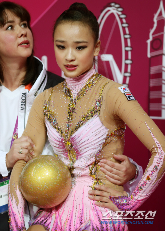 한국 리듬체조의 요정 손연재가 9일 오후(현지시각) 영국 런던 웹블리 아레나에서 열린 리듬체조 여자 개인종합 예선경기에서 'Limelight-Les Melodies De MonCoeur'에 맞춰 공연기를 선보인뒤 키스엔크라이에서 긴장된 표정을 짓고 있다. 손연재는 세계 정상급 선수들과 맞서 올림픽 사상 첫 결승진출을 노리게 된다. 20120807 런던=올림픽사진공동취재단m