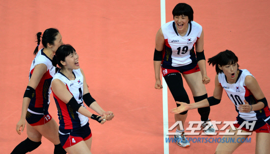 36년만에 올림픽 4강에 진출한 대한민국 여자배구 선수들이 9일(현지시간) 런던 얼스코트에서 열린 세계최강 미국과의 준결승에서 득점에 성공한 후 기뻐하고 있다. 120809.런던=올림픽사진공동취재단E