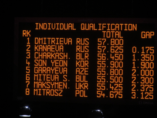 두종목 합산 55.900점으로 1위 드미트리예바(57.800점), 2위 카나예바(57.625점), 3위 리우부 차카시나(벨라루스, 56.450점)에 이어 중간합계 4위에 올랐다. 몽펠리에 세계선수권 당시 11위였던 '동양의 요정' 손연재의 반란이다.
