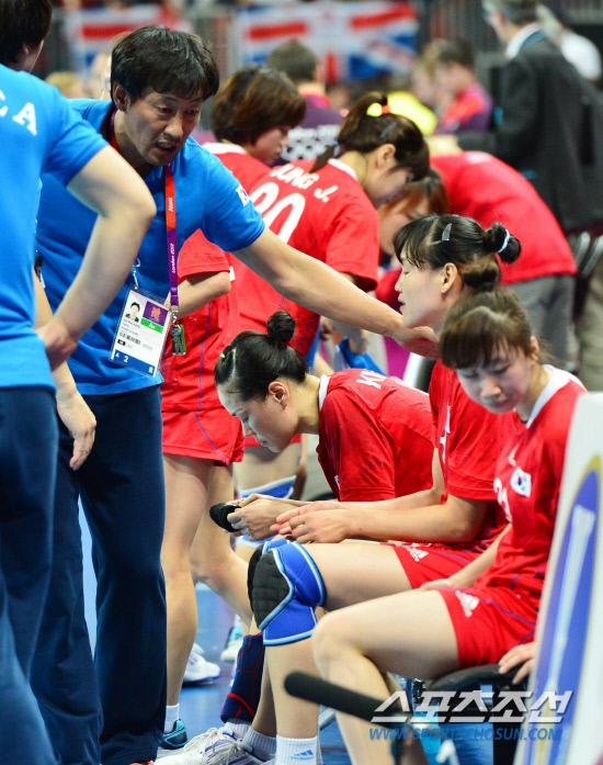 강재원 감독(사진왼쪽)이 9일 오후(현지시각) 영국 런던 올림픽파크 내 바스켓볼아레나에서 열린 여자핸드볼 준결승전 한국과 노르웨이의 경기에서 패한 뒤 침울해 하는 선수들을 격려하고 있다.