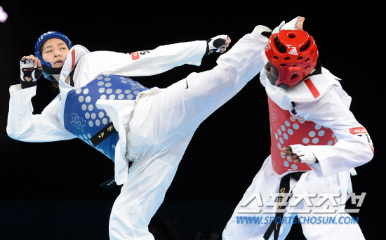 10일 오전(현지시간) 영국 런던 엑셀 사우스 아레나에서 열린 2012런던올림픽 태권도 여자 -67kg급에 출전한 황경선 선수가 16강전에세 코트디아부르의 루스 그바그비를 맞아 4-1로 제압하고 순조롭게 8강전에 진출 했다.황경선 선수가 루스 그바그비선수에게 공격을 펼치고 있다.20120810런던=올림픽사진공동취재단L
