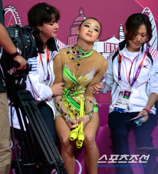 2012 런던올림픽 체조대표팀의 손연재가 10일(현지시간) 런던 웸블리 아레나에서 열린 리듬체조 개인종합 예선에서 곤봉 연기를 마친 뒤 선수 대기석에서 점수를 확인하며 아쉬움을 삼키고 있다.