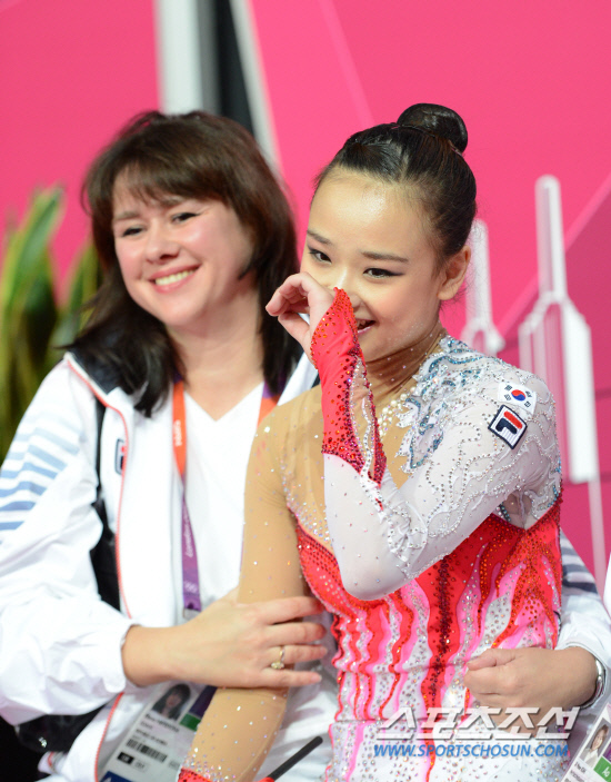 2012 런던올림픽 체조대표팀의 손연재가 10일(현지시간) 런던 웸블리 아레나에서 열린 리듬체조 개인종합 예선에서 리본 연기를 마친 뒤 선수대기석에서 점수를 기다리며 밝은 표정을 보이고 있다.
