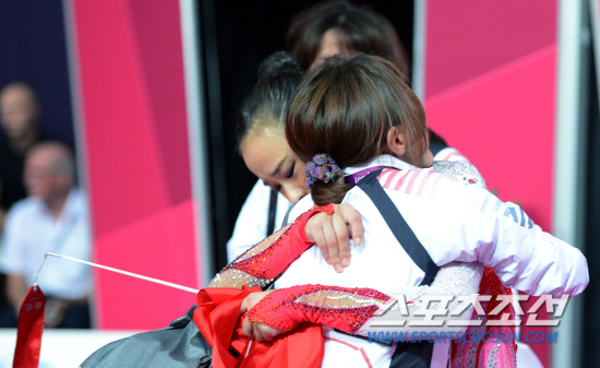 2012 런던올림픽 체조대표팀의 손연재가 10일(현지시간) 런던 웸블리 아레나에서 열린 리듬체조 개인종합 예선에서 리본 연기를 마친 뒤 선수대기석에서 코칭 스태프를 안으며 감동을 나누고 있다.