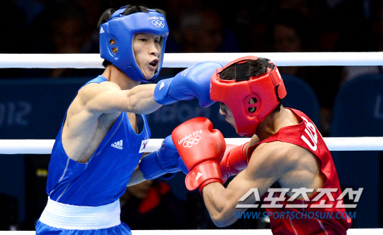 6일 밤(현지시각) 런던 엑셀 사우스 아레나에서 열린 2012런던올림픽 복싱 남자 라이트급 8강전에서 한국 한순철이 우즈베키스탄 파즐리딘 가이브나자로프에게 펀치를 날리고 있다.20120806런던=올림픽사진공동취재단L