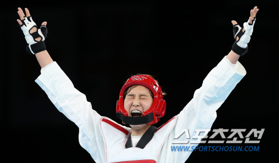 런던올림픽 태권도 여자 67kg급에 출전한 한국의 황경선이 10일 밤(현지시각) 런던 엑셀 사우스 아레나에서 열린 결승에서 터키의 누르 타타르를 누르고 우승을 확정지은 뒤 두 팔을 번쩍 들며 환호하고 있다.