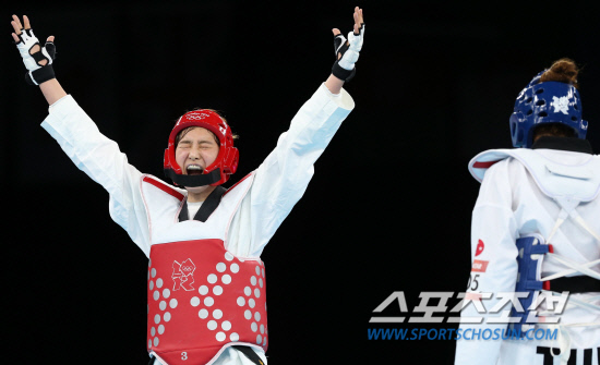 런던올림픽 태권도 여자 67kg급에 출전한 한국의 황경선이 10일 밤(현지시각) 런던 엑셀 사우스 아레나에서 열린 결승에서 터키의 누르 타타르를 누르고 우승을 확정지은 뒤 두 팔을 번쩍 들며 환호하고 있다.