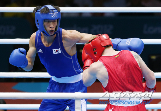 11일 밤(현지시각) 영국 런던 엑셀 노스아레나에서 열린 남자 복싱 라이트급(60㎏) 준결승에서 한순철 선수가 에발다스 페트로우스카스(리투아니아) 선수와 시합을 하고 있다. 한순철은 에발다스를 18-13으로 꺽고 결승에 진출했다. 20120811 런던=올림픽사진공동취재단m