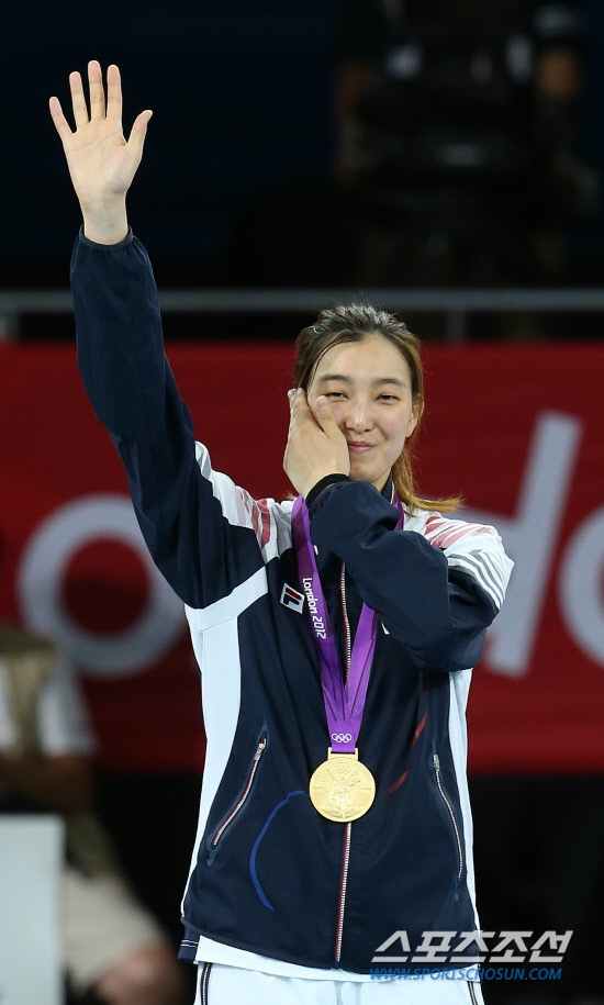 11일 밤(현지시각) 영국 런던 엑셀 노스아레나에서 열린 여자 태권도 -67㎏급 결승전에서 타타르 누르(터키) 선수를 누르고 금메달을 획득, 올림픽 2연패를 달성한 황경선 선수가 시상식에서 환호에 답하고 있다. 20120811 런던=올림픽사진공동취재단m