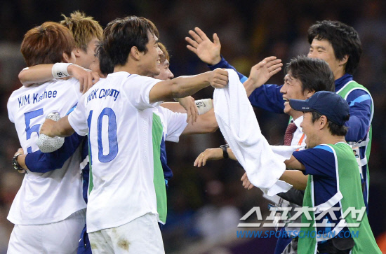 올림픽 축구대표팀 홍명보 감독이 10일(현지시간) 영국 카디프 밀레니엄 스타디움에서 열린 일본과의 경기에서 동메달을 획득하고 선수들과 기쁨을 나누고 있다.