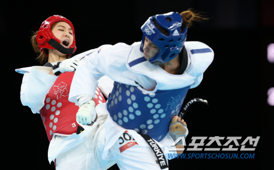 런던올림픽 태권도 여자 67kg급에 출전한 한국의 황경선이 10일 밤(현지시각) 런던 엑셀 사우스 아레나에서 열린 결승에서 터키의 누르 타타르를 맞아 우세한 경기를 펼치고 있다. 황경선은 12-5로 승리해 금메달을 목에 걸었다.