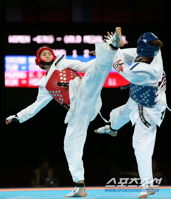 11일 밤(현지시각) 영국 런던 엑셀 노스아레나에서 열린 여자 태권도 -67㎏급 결승전에서 황경선(왼쪽) 선수가 타타르 누르(터키) 선수와 시합을 하고 있다. 황경선은 타타르 누르를 누르고 금메달을 획득해 올림픽 2연패를 달성했다. 20120811 런던=올림픽사진공동취재단m