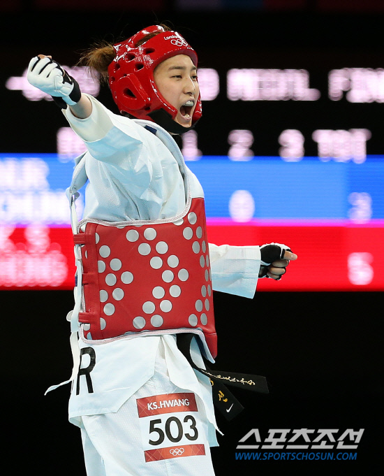 11일 밤(현지시각) 영국 런던 엑셀 노스아레나에서 열린 여자 태권도 -67㎏급 결승전에서 황경선 선수가 타타르 누르(터키) 선수와의 시합 중 득점에 환호하고 있다. 황경선은 타타르 누르를 누르고 금메달을 획득해 올림픽 2연패를 달성했다. 20120811 런던=올림픽사진공동취재단m