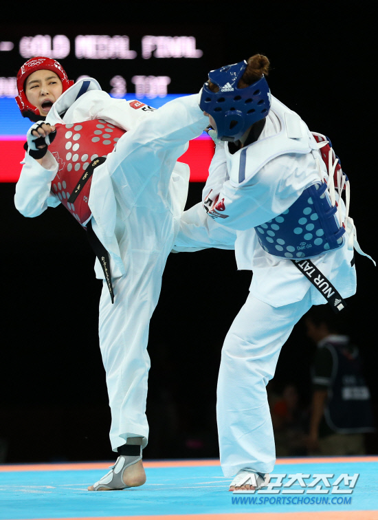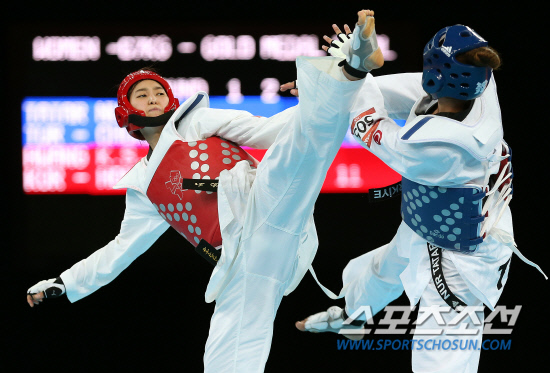11일 밤(현지시각) 영국 런던 엑셀 노스아레나에서 열린 여자 태권도 -67㎏급 결승전에서 황경선 선수가 타타르 누르(터키) 선수와 시합을 하고 있다. 황경선은 타타르 누르를 누르고 금메달을 획득해 올림픽 2연패를 달성했다. 20120811 런던=올림픽사진공동취재단m