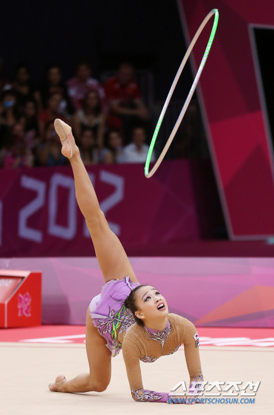체조요정 손연재가 11일 오후(현지시각) 영국 런던 웸블리 아레나에서 열린 리듬체조 여자 개인종합 결선에서 후프연기를 선보이고 있다. 손연재는 세계 정상급 선수들과 맞서 올림픽 사상 첫 메달 획득에 도전한다. 20120811 런던=올림픽사진공동취재단m