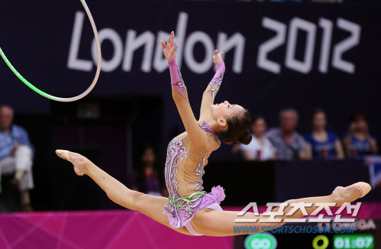 체조요정 손연재가 11일 오후(현지시각) 영국 런던 웸블리 아레나에서 열린 리듬체조 여자 개인종합 결선에서 후프연기를 선보이고 있다. 손연재는 세계 정상급 선수들과 맞서 올림픽 사상 첫 메달 획득에 도전한다. 20120811 런던=올림픽사진공동취재단m