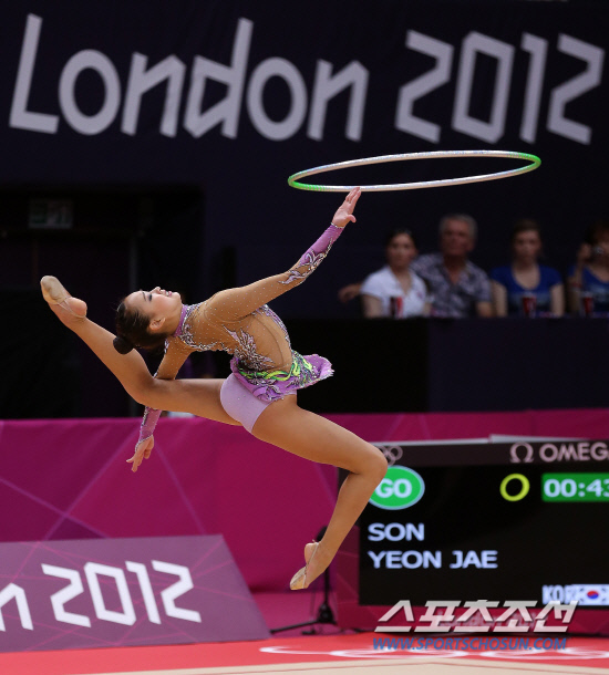 체조요정 손연재가 11일 오후(현지시각) 영국 런던 웸블리 아레나에서 열린 리듬체조 여자 개인종합 결선에서 후프연기를 선보이고 있다. 손연재는 세계 정상급 선수들과 맞서 올림픽 사상 첫 메달 획득에 도전한다. 20120811 런던=올림픽사진공동취재단m