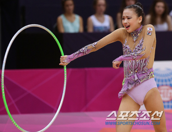 체조요정 손연재가 11일 오후(현지시각) 영국 런던 웸블리 아레나에서 열린 리듬체조 여자 개인종합 결선에서 후프연기를 마친뒤 환호에 답하고 있다. 손연재는 세계 정상급 선수들과 맞서 올림픽 사상 첫 메달 획득에 도전한다. 20120811 런던=올림픽사진공동취재단m