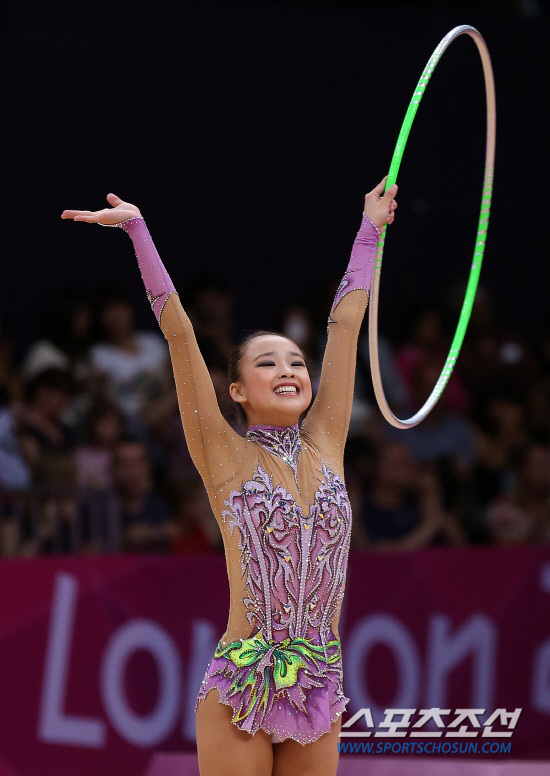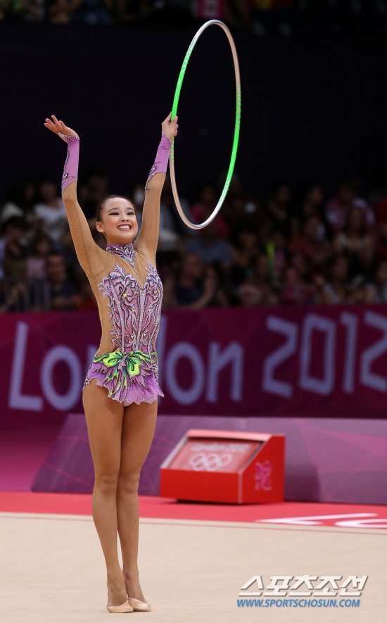 체조요정 손연재가 11일 오후(현지시각) 영국 런던 웸블리 아레나에서 열린 리듬체조 여자 개인종합 결선에서 후프연기를 마친뒤 환호에 답하고 있다. 손연재는 세계 정상급 선수들과 맞서 올림픽 사상 첫 메달 획득에 도전한다. 20120811 런던=올림픽사진공동취재단m